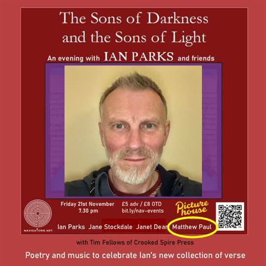 I’ll be reading tomorrow evening as one of the guests at the York launch of Ian Parks’s terrific new collection, The Sons of Darkness and the Sons of Light (Crooked Spire Press). As well as Ian and me, there will be more poetry from Janet Dean, music from Jane Stockdale, and an interview with Ian by Tim Fellows, Crooked Spire supremo.