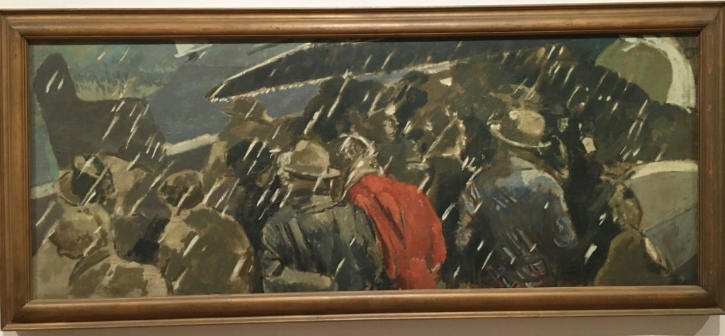 The second indented couplet takes the reader to another landscape via what might be pictures in a children’s book or a copy of National Geographic. The descriptions are very precise: not just an ‘ice cutter’ but one who hails from ‘Alaska’; and the men are ‘small’, a word given extra emphasis by its effective delayed appearance due to the preceding line-break. Fokkina’s well-judged use of specificity is underlined by the fact that she doesn’t overdo it; the deployment of ‘coloured’ is restrained – the anoraks aren’t necessarily multicoloured and so a semblance of ambiguity is retained. I suspect the fact that Waterhouse used a specific colour for the cagoule in his poem may have been decisive here.